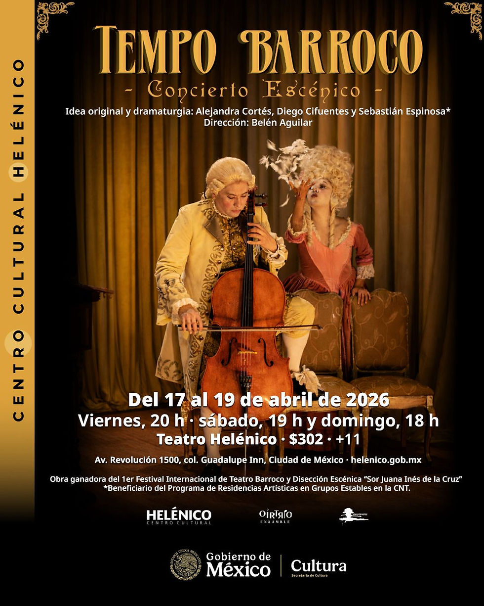 Tempo Barroco es un juego de imaginación donde cuatro personajes históricos, que en realidad nunca coincidieron en tiempo ni geografía, se encuentran —junto con el público— en una extravagante tertulia barroca. Una comedia irreverente que mezcla ficción histórica, música en vivo y guiños contemporáneos; una fiesta de humor, excesos y anacronismos, interpretada con virtuosismo por cuatro artistas de la escena actual en México.
